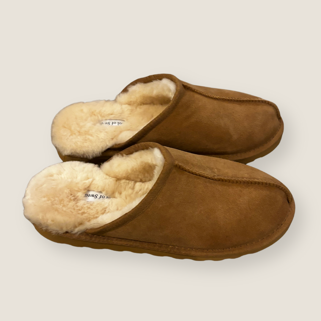 Tofflorna är gjorda av äkta fårskinn, med mjuk ull på insidan och läder på utsidan. Sulan är halkfri för extra säkerhet.